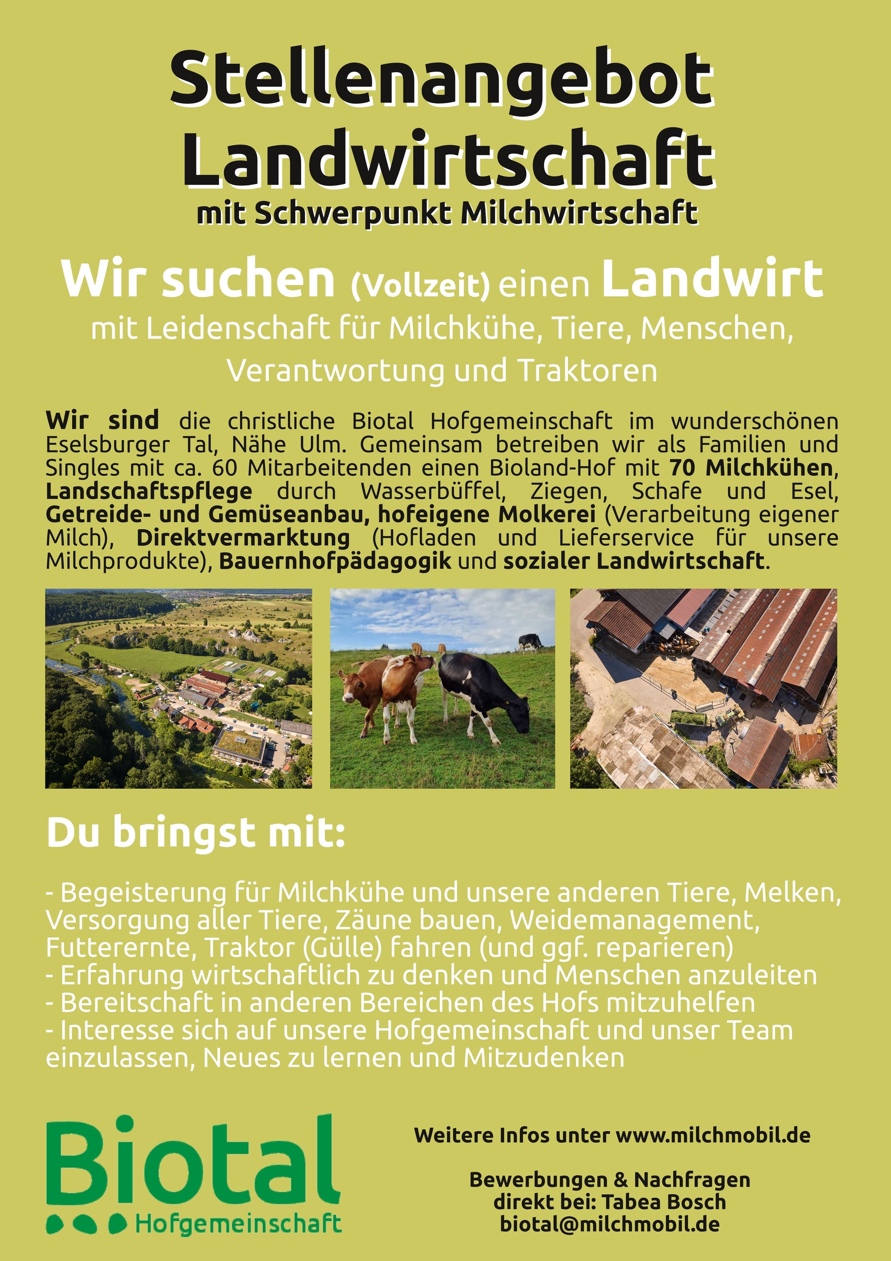 Wir sind die christliche Biotal Hofgemeinschaft im wunderschönen Eselsburger Tal, Nähe Ulm. Gemeinsam betreiben wir als Familien und Singles mit ca. 60 Mitarbeitenden einen Bioland-Hof mit 70 Milchkühen, Landschaftspflege durch Wasserbüffel, Ziegen, Schafe und Esel, Getreide- und Gemüseanbau, hofeigene Molkerei (Verarbeitung eigener Milch), Direktvermarktung (Hofladen und Lieferservice für unsere Milchprodukte), Bauernhofpädagogik und sozialer Landwirtschaft.